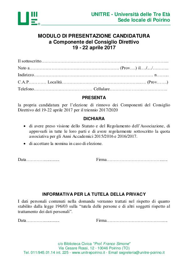 MODULO DI PRESENTAZIONE CANDIDATURA a Componente del Consiglio Direttivo 19- 22 aprile 2017