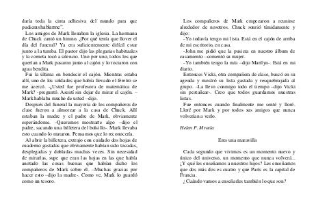 daría toda la cinta adhesiva del mundo para que pudieras hablarme”. Los amigos de Mark llenaban la iglesia. La hermana de Chuck cantó un himno. ¿ Por qué tenía que llover el día del funeral? Ya era suficientemente difícil estar junto a la tumba. El pastor dijo las plegarias habituales y la corneta tocó a silencio. Uno por uno, todos los que querían a Mark pasaron junto al cajón y lo rociaron con agua bendita. Fui la última en bendecir el cajón. Mientras estaba allí, uno de los soldados que había llevado el féretro se me acercó.- ¿ Usted fue profesora de matemática de Mark?-preguntó. Asentí sin dejar de mirar el cajón. – Mark hablaba mucho de usted – dijo. Después del funeral la mayoría de los compañeros de clase fueron a almorzar a la casa de Chuck. Allí estaban la madre y el padre de Mark, obviamente esperándome. – Queremos mostrarte algo – dijo el padre, sacando una billetera del bolsillo-. Mark llevaba esto cuando lo mataron. Pensamos que lo reconocería. Al abrir la billetera, extrajo con cuidado dos hojas de cuaderno gastadas que obviamente habían sido tocadas, desplegadas y dobladas muchas veces. Sin necesidad de mirarlas, supe que eran las hojas en las que había anotado las cosas buenas que habían dicho los compañeros de Mark sobre él. – Muchas gracias por hacer esto – dijo la madre-. Como ve, Mark lo guardó como un tesoro.