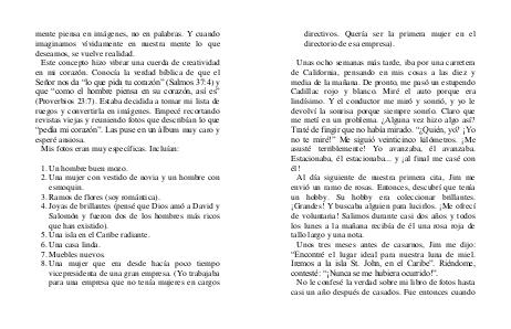 mente piensa en imágenes, no en palabras. Y cuando imaginamos vívidamente en nuestra mente lo que deseamos, se vuelve realidad. Este concepto hizo vibrar una cuerda de creatividad en mi corazón. Conocía la verdad bíblica de que el Señor nos da“ lo que pida tu corazón”( Salmos 37:4) y que“ como el hombre piensa en su corazón, así es”( Proverbios 23:7). Estaba decidida a tomar mi lista de ruegos y convertirla en imágenes. Empecé recortando revistas viejas y reuniendo fotos que describían lo que“ pedía mi corazón”. Las puse en un álbum muy caro y esperé ansiosa. Mis fotos eran muy específicas. Incluían: