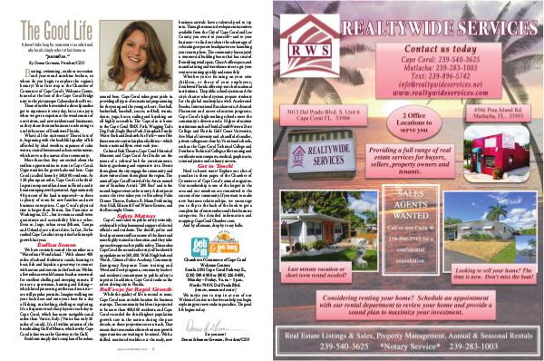 Need to know more? Explore our slice of paradise in these pages of the Chamber of Commerce of Cape Coral’ s annual magazine. Our membership is one of the largest in the area and our members are committed to the success of our community. If you want to make new business relationships, we encourage you to flip to the back of the book to get a complete list of our members and their business categories. For detailed information and mapping: CapeCoralChamber. com. And by all means, drop by to say hello.
