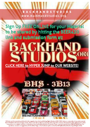 All Music and Art materials published in this magazine have their publishing Rights Retained. BHS- 3B13 claims no ownership of any artist material that is Published. All music, images, tracks, video's and other media are owned by their respective creators. All material is either gifted by the artists in question, or is original creations or alterations done by BackHandStudios Production Team, or posted material from FREE LISCENSE sites. For questions, concerns or suggestions, hit the Editor Page, or the feedback option on the Beer420 @BackHandStudios.Org All Rights 2016.