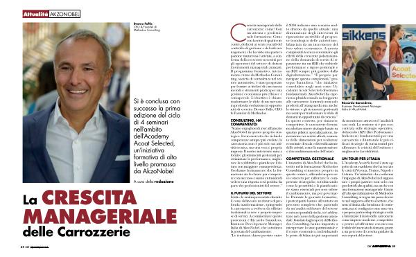 UN TOUR PER L’ ITALIA L’ Academy Acoat Selected è stata oggetto di un roadshow che ha toccato le città di Verona, Torino, Napoli e Catania. Un’ iniziativa che conferma l’ impegno di AkzoNobel nel supportare i propri partner non solo con prodotti di alta qualità, ma anche con una formazione manageriale. Grazie all’ alta specializzazione di Methodos Consulting, si segna un passo decisivo nel supporto offerto al settore, che non si limita alla fornitura di contenuti, ma si configura come una vera e propria partnership strategica volta a valorizzare il ruolo delle carrozzerie come imprese moderne, competitive e pronte ad affrontare con successo le sfide del mercato di domani, grazie a un percorso di crescita guidato da veri esperti del settore.