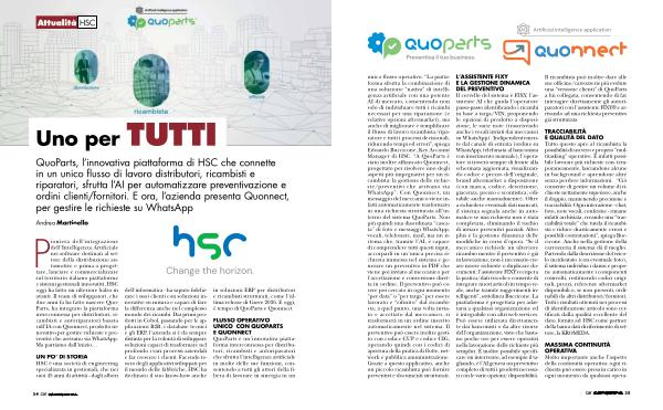 unico flusso operativo.“ La piattaforma sfrutta la combinazione di una soluzione“ nativa” di intelligenza artificiale con una potente AI di mercato, consentendo non solo di individuare tutti i ricambi necessari per una riparazione( e relative opzioni aftermarket), ma anche di migliorare e semplificare il flusso di lavoro ricambista / riparatore e tutti i processi decisionali, riducendo tempi ed errori”, spiega Edoardo Buccicone, Key Account Manager di HSC.“ A QuoParts è stato inoltre affiancato Quonnect, progettato per risolvere uno degli aspetti più impegnativi per un ricambista: la gestione delle richieste / preventivi che arrivano via WhatsApp”. Con Quonnect, un messaggio del meccanico viene infatti automaticamente trasformato in una richiesta strutturata all’ interno del sistema QuoParts. Non più quindi una disordinata“ cascata” di foto e messaggi WhatsApp, vocali, telefonate, mail, ma un sistema che, tramite l’ AI, è capace di comprendere tutti questi input, accorparli in un’ unica precisa richiesta immessa nel sistema e generare un preventivo in PDF che viene poi inviato al meccanico per l’ accettazione e conversione diretta in ordine. Il preventivo può essere poi cercato in ogni momento“ per data” o“ per targa” per essere lavorato e“ rifinito” dal ricambista; a quel punto, una volta inviato e accettato dal meccanico, si trasformerà in un ordine inserito automaticamente nel sistema. Il preventivo può essere inoltre gestito con codice CUP e codice CIG, operando quindi con i codici di apertura della pratica di flotte, network e pubblica amministrazione. Grazie a questo applicativo, anche un piccolo ricambista può fornire preventivi e documenti strutturati.