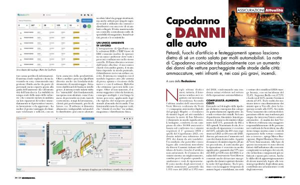 COMPLESSITÀ AUMENTA COSTI Entrando nel dettaglio delle tipologie di danno, emergono due categorie particolarmente significative: incendi e rotture dei cristalli. Nel caso di parabrezza, finestrini e lunotti posteriori, il numero dei sinistri è diminuito dell’ 11 %, passando da 482 a 423 episodi. Nonostante il calo, il costo medio di riparazione è cresciuto del 62 %, salendo dai 281 euro registrati nel 2025 ai 456 euro del 2026. Ancora più marcato l’ aumento nel caso dei danni da incendio. A parità di numero di sinistri rispetto all’ anno precedente, il costo medio per la riparazione è cresciuto in modo significativo, passando dai 577 euro del 2025 ai 4.236 euro del 2026. L’ a- nalisi dell’ osservatorio Verti Movers consente anche di tracciare una geografia dei danni registrati durante la notte di Capodanno. Tra le province con la maggiore frequenza di sinistri legati a vandalismi, incendi e rotture dei cristalli nel 2026 emerge Isernia, con un’ incidenza del 15,6 %. Seguono Biella con il 7,9 % e Lodi con il 4,6 %, mentre Gorizia si attesta al 3,6 %. Tra le realtà che mostrano invece una diminuzione dei sinistri spicca Vercelli, dove la frequenza scende allo 0,8 %. Secondo Verti, l’ aumento dei costi medi di riparazione riflette una tendenza più ampia che interessa l’ intero settore automotive. « L’ analisi dei dati Verti Movers evidenzia una maggiore responsabilizzazione delle persone nei confronti dei beni altrui, ma allo stesso tempo mostra come i costi di riparazione delle vetture continuino a crescere », spiega Marco Buccigrossi, Digital Business Director di Verti Assicurazioni. Alla base di questo incremento vi sono diversi fattori: dall’ inflazione alla crescente complessità tecnologica dei veicoli, che richiedono componenti più sofisticati e spesso più costosi. Anche le difficoltà di approvvigionamento di alcuni materiali, legate alle tensioni geopolitiche degli ultimi anni, contribuiscono ad aumentare i costi degli interventi.