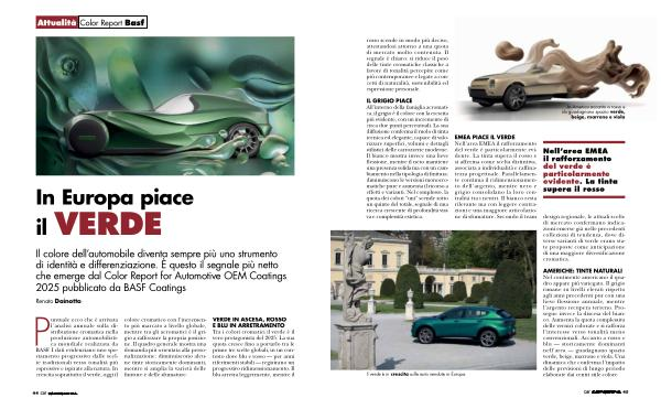 AMERICHE: TINTE NATURALI Nel continente americano il quadro appare più variegato. Il grigio rimane su livelli elevati rispetto agli anni precedenti pur con una lieve flessione annuale, mentre l’ argento recupera terreno. Prosegue invece la discesa del bianco. Aumenta la quota complessiva delle vernici colorate e si rafforza l’ interesse verso tonalità meno convenzionali. Accanto a rosso e blu— storicamente dominanti nell’ area— guadagnano spazio verde, beige, marrone e viola. Una dinamica che conferma l’ impatto delle previsioni di lungo periodo elaborate dai centri stile colore.