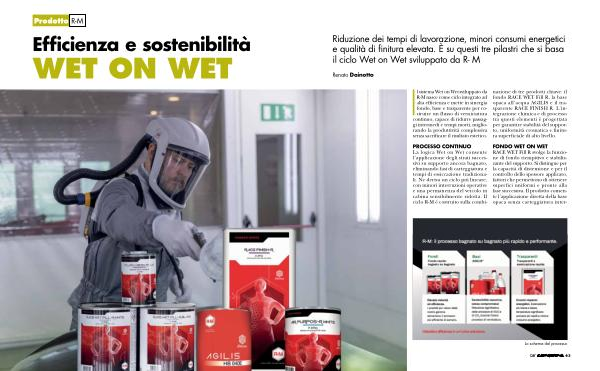 Il sistema Wet on Wet sviluppato da R-M nasce come ciclo integrato ad alta efficienza e mette in sinergia fondo, base e trasparente per costruire un flusso di verniciatura continuo, capace di ridurre passaggi intermedi e tempi morti, migliorando la produttività complessiva senza sacrificare il risultato estetico.