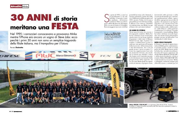 30 ANNI DI STORIA Trent’ anni di storia, di crescita e di traguardi condivisi. Mirka Italia ha celebrato il suo trentesimo anniversario in un luogo simbolo di passione e sfide vinte: il Misano World Circuit. Qui, il primo settembre i collaboratori si sono riuniti per una giornata all’ insegna della sicurezza, della formazione e del divertimento. Tra corsi di guida sicura e prove in pista, l’ e- vento ha rappresentato non solo un momento di festa, ma anche un’ occasione per ribadire i valori che hanno reso l’ azienda un punto di riferimento nel mondo della preparazione delle superfici. In tre decenni Mirka Italia ha saputo evolversi insieme al proprio team, investendo sulle persone e sulla crescita professionale per costruire un’ organizzazione solida, capace di offrire ogni giorno un servizio di qualità e di mantenere un legame autentico con i clienti. Il successo dell’ azienda è il risultato di una cultura fondata sulla collaborazione, sulla fiducia e sulla passione condivisa per l’ eccellenza. Unendo formazione e team building, Mirka ha voluto celebrare non solo il passato, ma anche la forza del proprio gruppo, pronto ad affrontare con entusiasmo le sfide future.