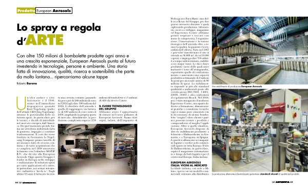 Un’ idea audace e rivoluzionaria: è il 1946, siamo nell’ immediato dopoguerra quando Kurt Vogelsang( padre dell’ attuale CEO Jürg Vogelsang) intuisce le potenzialità delle soluzioni spray, in particolare per le vernici, e decide di introdurle nel mercato europeo dall’ America. Da quel momento prende forma un’ avventura industriale fatta di passione, impegno e continue trasformazioni. È così che viene fondata in Germania la Vogelsang Company, primo tassello di un mosaico fatto di crescita continua e di varie acquisizioni che si completa nel 1998 attraverso la fusione con l’ olandese MOTIP B. V., che dà vita alla European Aerosols. Oggi questo Gruppo è leader in Europa nello sviluppo e realizzazione di soluzioni spray per varie applicazioni ed è attivo, in particolare, nei settori automotive, industria e‘ fai da te’. Negli ultimi 10 anni il fatturato ha avuto una crescita costante, passando da poco più di 200 milioni di euro nel 2014 agli oltre 300 milioni del 2024. L’ obiettivo dell’ azienda è quello di raggiungere un fatturato di 400 milioni di euro entro il 2030, ampliando la propria quota di mercato. Attualmente, la produzione complessiva supera i 150 milioni di bombolette e i 5 milioni di stilo da ritocco l’ anno.