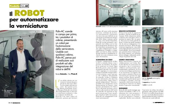 BRACCIO AUTONOMO Il braccio ha anche la capacità di prendere e lasciare le pistole in autonomia. Nella cabina viene infatti realizzata una rastrelliera dove si mettono la camera 3D e tre pistole. Non sono necessarie pistole dedicate: il robot usa quelle standard che da anni accompagnano i verniciatori nel lavoro. Boticelli può verniciare singoli pezzi, come nella nostra dimostrazione presso la Carrozzeria Roldo, che ne sta testando uno, parti di vettura o l’ intera auto. Può anche sfumare ed è all’ inizio del suo sviluppo, utilizzando anche l’ AI per la gestione dei cicli.