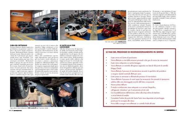 LE AUTO ALLA FINE LUCCICANO Alla fine del processo di riparazione della carrozzeria le auto vengono lucidate e pulite a fondo anche negli interni, con il vapore che disinfetta e rimuove i batteri che causano cattivo odore. Nella struttura ci sono anche delle addette alla tappezzeria per le eventuali riparazioni necessarie. Quando l’ auto è terminata questa viene inviata a uno dei tre limbi fotografici, dove viene fotografata e filmata per poi essere caricata nel sito Autohero, il canale di vendita digitale. In attesa di un nuovo proprietario la vettura viene inviata allo stoccag-