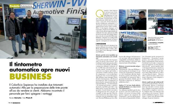 Quando è stato lanciato sul mercato il tintometro automatico Alfa Dispenser si è immediatamente capito che avrebbe rivoluzionato il ciclo di produzione delle tinte in carrozzeria, e non solo. Il suo funzionamento totalmente automatico e a elevata precisione si presta a tante applicazioni anche nella vendita. Non c’ è da stupirsi, dunque, se il Colorificio Sapienza di Milano ha colto al volo questa opportunità installando ben due tintometri CR4 presso la sua sede di Cologno Monzese caricati con i prodotti Sherwin- Williams: obiettivo la vendita della tinta pronta direttamente al banco oppure consegnata in carrozzeria.