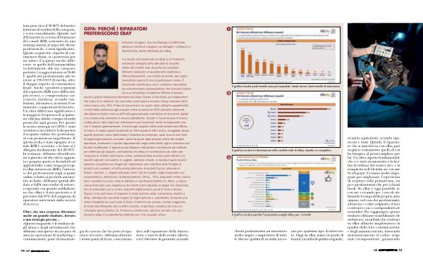 clienti professionisti un inventario molto ampio, comprensivo di tutte le diverse qualità di ricambi necessari per qualsiasi tipo di intervento. Oggi su eBay siamo in grado di fornire ricambi di qualità originale, ricambi equivalenti, ricambi rigenerati e usati. Quindi, il riparatore che si interfaccia con eBay può scegliere esattamente quello di cui ha bisogno, al prezzo migliore per lui. Un altro aspetto fondamentale che ci è stato riconosciuto è la facilità di utilizzo del nostro sito, e la semplicità nell’ identificare i ricambi adeguati. Ci siamo molto impegnati per migliorare l’ esperienza di acquisto sulla piattaforma, sia per i professionisti che per i clienti finali. Su eBay è oggi possibile ricercare i ricambi per i veicoli utilizzando la targa della propria auto oppure, nel caso dei professionisti, attraverso i codici originali e il loro confronto con i corrispondenti aftermarket. Per raggiungere questo risultato abbiamo sensibilizzato distributori e ricambisti che vendono su eBay affinché migliorassero la qualità della loro comunicazione e degli annunci sul sito, inserendo sistematicamente il codice originale corrispondente, garantendo
