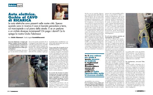 Le auto elettriche sono presenti nelle nostre città . Spesso quando sono in ricarica il cavo è lasciato penzolare a terra , sul marciapiede o sul piano della strada . E se un pedone o un ciclista dovesse inciampare ? Chi paga i danni ? Ce lo spiega la nostra Giulia Talamazzi