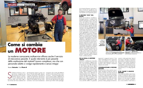 IL MOTORE “ ESCE ” DAL BASSO Nelle auto moderne , in fabbrica , il gruppo motore e cambio viene montato dal basso verso l ’ alto , da sotto , e poi si blocca tutto con i supporti e la culla che sorregge le sospensioni anteriori . Un tempo si faceva l ’ operazione opposta : si calava il motore dall ’ alto appoggiandolo sul telaio con i supporti motore . La sostituzione del motore , quindi , avviene liberando il motore stesso ( resta appoggiato a un banco ) e sollevando la carrozzeria . Cristian Pagani ci ha guidato passo passo nelle fasi preparatorie . Bisogna smontare tutto quello che si trova collegato o appoggiato al motore . Nella vettura di questo servizio con motore in posizione trasversale e trazione anteriore si inizia con l ’ e- liminare l ’ alimentazione : condotti , scatola filtro aria , airbox ( collettori aspirazione a lunghezza variabile ), iniettori . Poi si passa alla parte accensione : bobine , batterie , cavi e il polipo , ovvero tutta la rete elettrica del motore . Poi si scollegano i collettori di scarico dalla testa del motore . A questo punto si solleva l ’ auto e si lavora da sotto .