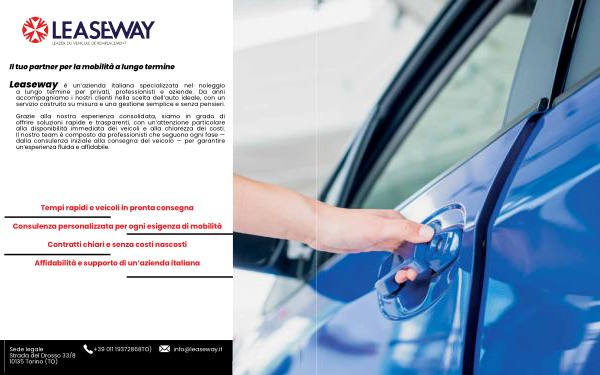 Leaseway è un’ azienda italiana specializzata nel noleggio a lungo termine per privati, professionisti e aziende. Da anni accompagniamo i nostri clienti nella scelta dell’ auto ideale, con un servizio costruito su misura e una gestione semplice e senza pensieri.