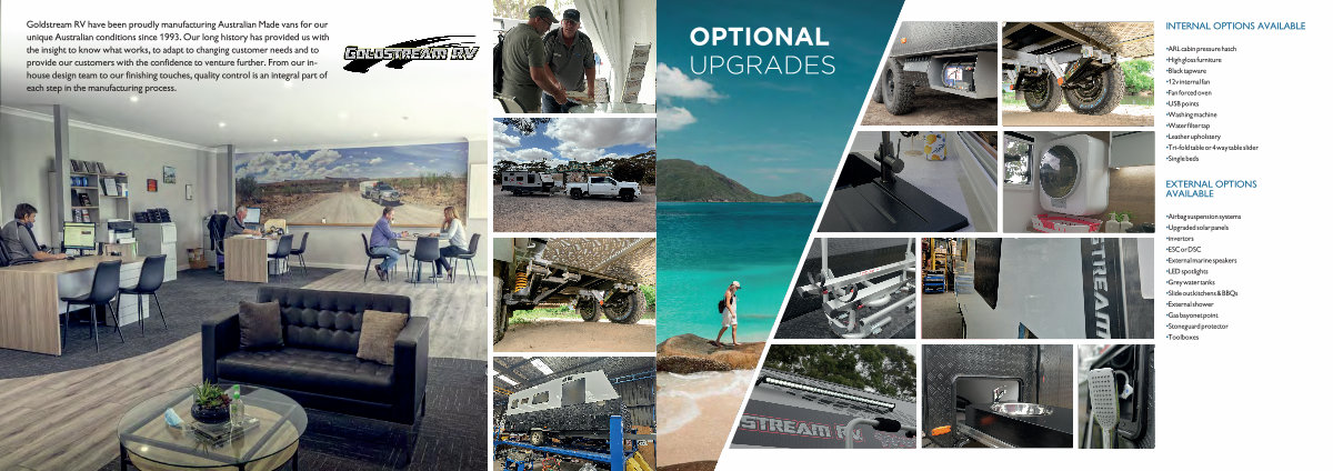 Goldstream RV have been proudly manufacturing Australian Made vans for our unique Australian conditions since 1993 . Our long history has provided us with the insight to know what works , to adapt to changing customer needs and to provide our customers with the confidence to venture further . From our inhouse design team to our finishing touches , quality control is an integral part of each step in the manufacturing process .