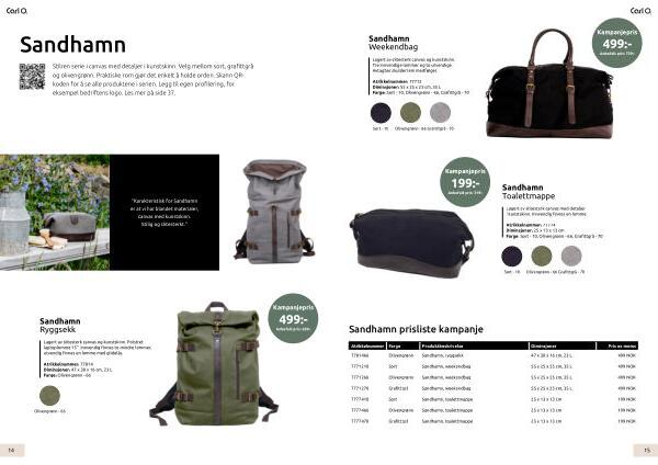 Lette og smidige produkter, laget av et vannavvisende materiale med vanntett glidelås. Perfekt for mange ulike aktiviteter, for eksempel reiser, sport, helgeturer og utflukter. Finnes i fargene sort, olivengrønn og khaki. Skann QR-koden for å se alle produktene i serien. Legg til egen profilering, for eksempel bedriftens logo. Les mer på side 37.