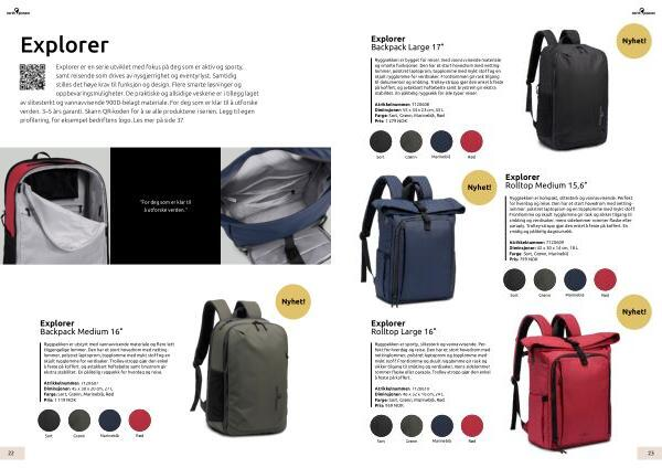 Praktiske, smidige og romslige produkter som i tillegg tåler det meste. Smarte funksjoner som gjør livet litt enklere. Skann QR-koden for å se alle produktene i serien. Legg til egen profilering, for eksempel bedriftens logo. Les mer på side 37.