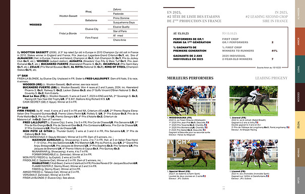 1 ST DAM FRIDA LA BLONDE, by Elusive City. Unplaced in FR. Sister to FRED LALLOUPET. Dam of 6 foals, 5 to race, 4 winners: WOODED( IRE)( c. Wootton Bassett). Gr. 1 winner, see race record. BUCANERO FUERTE( GB)( c. Wootton Bassett). Won 4 races at 2 and 3 years, 2024, inc. Keeneland Phoenix S. Gr. 1, Railway S. Gr. 2, Lacken Stakes Gr. 3, also 3 rd Goffs Vincent O ' Brien National S. Gr. 1, Coventry S. Gr. 2, from 8 starts.