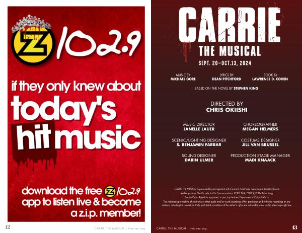 CARRIE THE MUSICAL is presented by arrangement with Concord Theatricals . www . concordtheatricals . com Media sponsors : The Gazette , ImOn Communications , KCRG TV-9 , Z102.9 , ICAN Advertising . Theatre Cedar Rapids is supported , in part , by the Iowa Department of Cultural Affairs .
