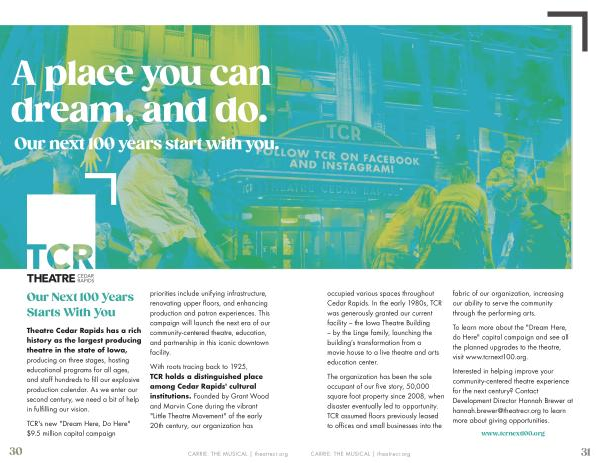 To learn more about the " Dream Here , do Here " capital campaign and see all the planned upgrades to the theatre , visit www . tcrnext100 . org .