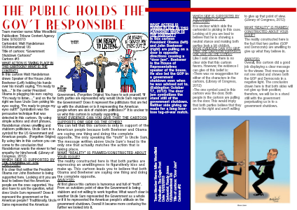 Overall, this cartoon did a good job displaying a clear message to the viewer. That message is not one sided and shows both the GOP and Democrats in a negative light. The conclusion drawn here is that both sides will not give up their position; therefore, we will be in a stand still with the government perpetuating us in to a government shutdown.