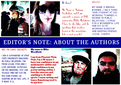 MY NAME IS BREANA BONNER. I AM A THIRD YEAR STUDENT AT USU WORKING TOWARDS A DEGREE IN PUBLIC RELATIONS. I STRIVE FOR A WONDERFUL LIFE AND DO SO BY WORKING NONSTOP AND KEEPING FRIENDS CLOSE. CHEERS!