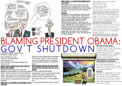 The cartoonist uses labeling to point out some possibly not so obvious figures. Senator Ted Cruz and Senator Mike Lee are both republican (Jason, 2014) senators that were working against The Affordable Health Care Act. President Barack Obama, a democrat, is the person being pointed out as the problem in this image. Although this is what appears to be the situation, the cartoonist actually portrays President Obama as the victim and the senators as the aggressors. The cartoon is sympathetic towards the president in the fact that he is taking the blame when, in fact, the Republicans are also to blame.