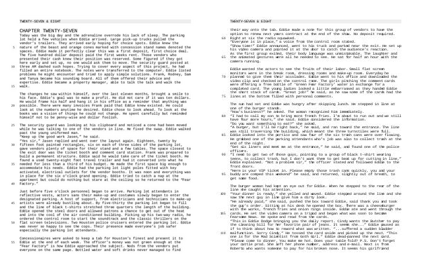 110 their way onto the tab. Eddie made a note for this group of vendors to have the option to renew next years contract at the end of the show. No deposit required. Right at six the radio squawked.“ Everyone is in place,” a voice from the control room stated.“ Show time!” Eddie announced, went to his truck and parked near the exit. He set up his video camera and pointed it at the door to catch the audience’ s reaction. As the first group exited, their body language was unmistakable. The laughter and the animated gestures were all he needed to see. He sat for half an hour with the camera running.