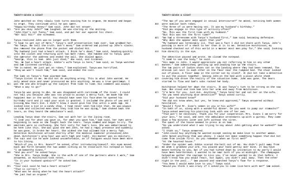 “ The two of you were engaged in sexual intercourse?” he asked, noticing both women wore similar bath robes.“ The three of us were having sex. It was my husband’ s birthday.”“ Did you engage in this type of activity often?”“ No. This was the first time with my husband.”“ But this was not the first time?”“ We had a threesome with Tanya’ s husband first,” Sam said, becoming defensive.“ Why does she appear more upset than you?”“ My husband was terminally ill. That was a fact I did not share with Tanya. John’ s passing is more of a shock to her than it is to me. Detective Hutchinson, my husband checked out of this world in a manner most men pray for,” She said, looking him directly in the eye.