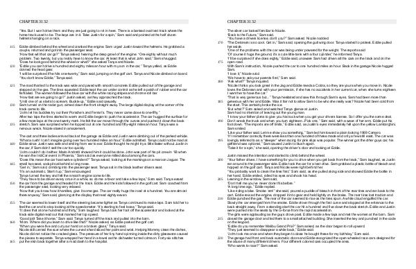 Justin missed the intention and started to climb behind the wheel.“ Your father drives. I have something for you to drive when you get back from the track,” Sam laughed, as Justin ran around to the passenger side. Eddie took the car for a test drive. Sam grabbed a plastic bottle of bleach and hopped on the golf cart. Tanya and Nicole were right behind her.“ You probably want to clean the tires first,” Sam said, as she pulled along side and showed Eddie the bottle in her hand. Eddie smiled, rolled his eyes and shook his head. Leaning in the window, Sam said,“ Don’ t tell me you’ ve never done this before.”“ A long time ago,” Eddie replied.“ Like riding a bike. Smoke‘ em!” she said, poured a puddle of bleach in front of the rear tires and ran back to the cart. Eddie revved the engine, dropped it into gear and held lightly on the brake. The rear tires lost traction and Eddie punched the gas. The rear of the car seemed to rise as the tires spun. A white cloud engulfed the car. Slowly the car emerged from the smoke. Eddie drove through the first curve and stopped at the entrance to the back straight away. From a standing start the car hit a hundred and five down the back stretch. Eddie and Justin were pushed into the seats by the G-force from the rapid acceleration. The girls were applauding as the guys drove past. Eddie made a few laps and met the women at the barn. Sam closed the garage door and led them to a small attached building. She inserted the key and punched in the code on the keypad.“ Eddie do you remember Malibu Grand Prix?” Sam asked, as the door began to roll upward.“ They just seemed to disappear a while back,” Eddie said.“ John took me once and when they began to close he bought these for my birthday,” Sam said. The garage had front and back automatic doors and Eddie recognized the open wheeled race cars designed for the abuse of many different drivers. Four different colored cars occupied the area.“ Who wants to race?” Sam asked.