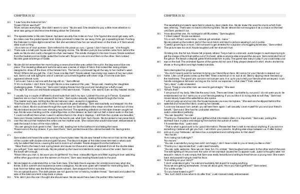 The speedometer in Nicole’ s Nissan had seen seventy-five miles an hour. She figured she could get away with ten miles over the posted speed limit. Eddie promised to take the car away if she got a speeding ticket. Pushing the Delorean to triple digits scared her. But she wondered how her car would react on the track or if Sam would allow such a thing.“ I live here as of next summer. Sam referred to this place as ours. I guess I don’ t have to ask,” she thought. There was a small pool house with two changing rooms. The filtration pump’ s low rumble came from behind the walls as Nicole and Justin changed into their swimwear. The adults changed in the main house. Nicole watched from the heated pool as Eddie exited the home with Tanya on one arm and Sam on the other. Sam noticed Nicole’ s gaze and let go of Eddie.