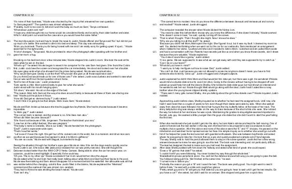 The computer revealed the answer when Nicole clicked the history icon.“ You need to clear this before Mom knows why you know the difference, if she doesn’ t already,” Nicole warned.“ She doesn’ t come in here,” he said, quickly turning off the screen.“ That is what I thought. Then I thought she might. Now I know she does.”“ Why are you telling me all this stuff?” he asked.“ Because you didn’ t tell Mom, Matt spent the night. She figured it out, but it was my fault. I cleaned my room too well. You started me thinking when we went out to the car for our swimsuits. Sam mentioned an arrangement when I talked to her alone. I pushed until she said I needed to talk to Mom. I watched as Sam pulled Mom aside and had a conversation with her. Parents have secrets just like us and when you know those secrets, don’ t share because they are valuable,” Nicole explained.“ You make it sound like a game,” Justin smiled.“ It is a game. We are supposed to to see what we can get away with and they are supposed to try to catch us.”“ Can I be on your team?”“ What did you have in mind?”“ I want you to help me figure out how to scare Dad,” Justin added.“ You can’ t do that. Just because you are not allowed to scare me anymore doesn’ t mean you have to find someone else to terrify. Grow up!” Justin shrugged and changed subjects.
