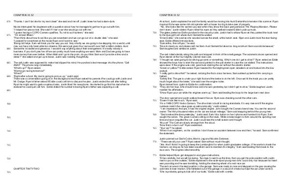 Nicole interrupted his daydream with a question about how he managed to get her to go out with him.“ I helped her pass a test. She said if I had a car she would go out with me.”“ I guess having a COPO Camaro qualifies. Try not to act fourteen,” she said.“ I’ m almost fifteen.”“ Then think about how to act like you are seventeen and we can go out on a double date.” she said.“ I passed for seventeen at the movie Ryan and I went to see.”“ Being tall helps. Sam will treat you the way you act. Very shortly we are going to be stepping into a world, until now, we have only been able too observe. We were just given four cars worth over half a million dollars. Aunt Samantha is loaded and generous. I wouldn’ t say anything about their arrangement. It’ s really nobody’ s business. If you don’ t piss her off we can pretty much have anything we want. Mom and Dad are going to have more money than ever before. When Matt and I go to the prom, do you think Sam won’ t provide a limo and a dress?” she asked and got up to leave. Justin was nodding thoughtfully.