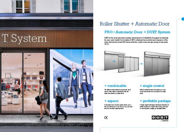 DUET is the most innovative system developed by COLLBAIX. Designed exclusively for ease and comfort for retailers. DUET combines the security and elegance of the roller shutters from the PRO Series with the comfort and energy saving of automatic doors.