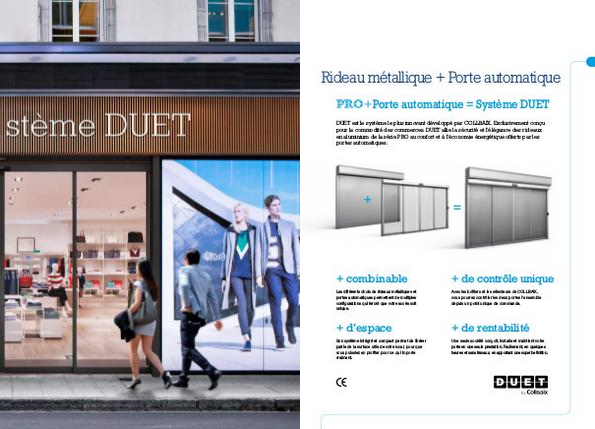 DUET est le système le plus innovant développé par COLLBAIX. Exclusivement conçu pour la commodité des commerces. DUET allie la sécurité et l’ élégance des rideaux en aluminium de la série PRO au confort et à l’ économie énergétique offerts par les portes automatiques.