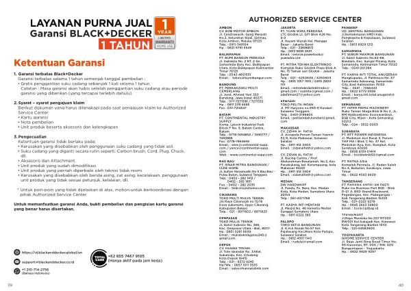 1 . Garansi terbatas Black + Decker Garansi terbatas selama 1 tahun semenjak tanggal pembelian :