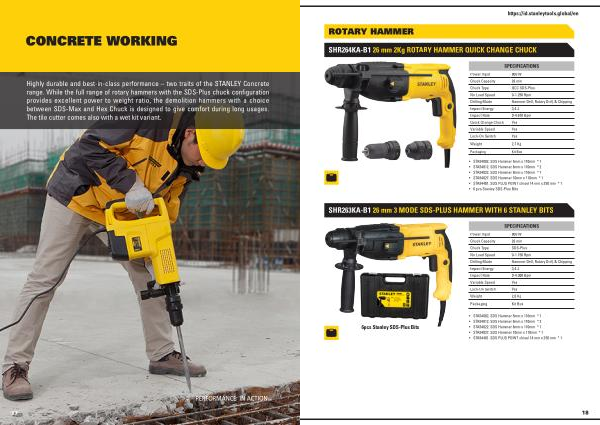 Highly durable and best-in-class performance – two traits of the STANLEY Concrete range . While the full range of rotary hammers with the SDS-Plus chuck configuration provides excellent power to weight ratio , the demolition hammers with a choice between SDS-Max and Hex Chuck is designed to give comfort during long usages . The tile cutter comes also with a wet kit variant .