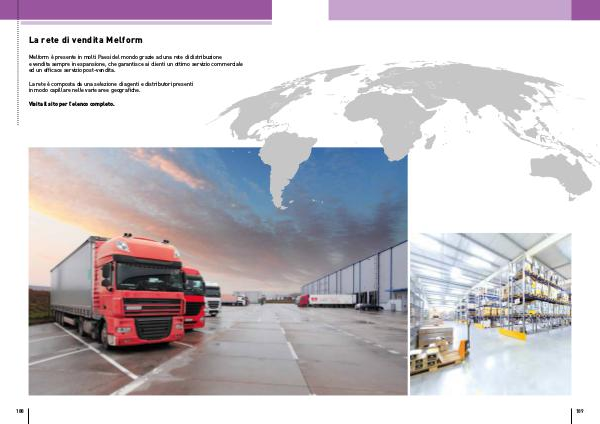 Melform è presente in molti Paesi del mondo grazie ad una rete di distribuzione e vendita sempre in espansione, che garantisce ai clienti un ottimo servizio commerciale ed un efficace servizio post-vendita.