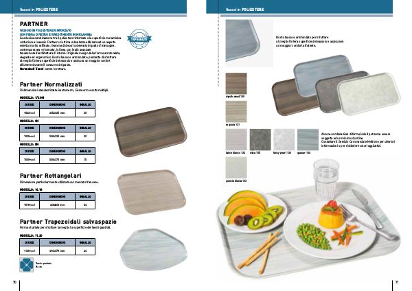 VASSOIO IN POLIESTERE RINFORZATO CON FIBRA DI VETRO E RIVESTIMENTO IN MELAMINA L’ esclusiva combinazione tra il poliestere rinforzato e la superficie melaminica conferisce al vassoio Partner un’ ottima robustezza abbinata ad un aspetto estetico molto raffinato. Gamma di decori ad elevato impatto d’ immagine, contemporanea e ricercata, in linea con le più avanzate tendenze dell’ architettura di interni. Originale design dalle forme arrotondate, elegante ed ergonomico. Bordo basso e arrotondato: permette di sfruttare al meglio l’ intera superficie del vassoio e assicura un maggior confort all’ utente durante il consumo del pasto. Garanzia di 5 anni contro le rotture.