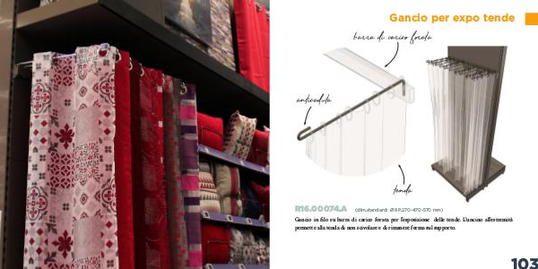 Gancio in filo su barra di carico forata per l’esposizione delle tende. L’uncino all’estremità