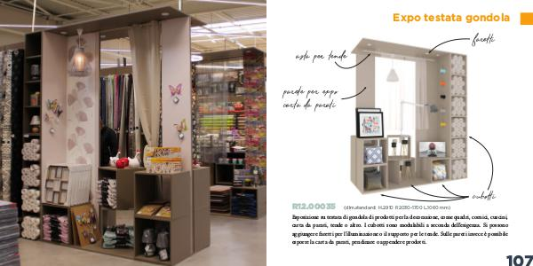 Esposizione su testata di gondola di prodotti per la decorazione, come quadri, cornici, cuscini,
