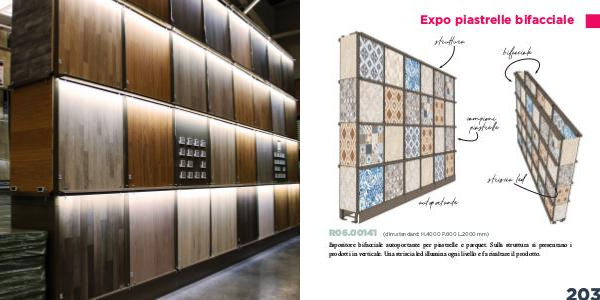 Espositore bifacciale autoportante per piastrelle e parquet. Sulla struttura si presentano i
