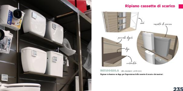 Ripiano in lamiera su doga per l’esposizione delle cassette di scarico dei sanitari.