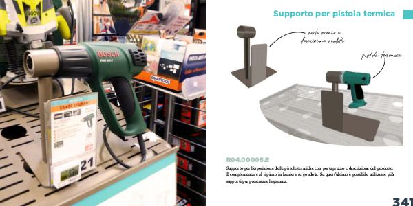Supporto per l’esposizione delle pistole termiche con portaprezzo e descrizione del prodotto.