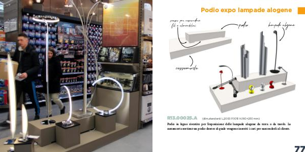 Podio in legno rivestito per l’esposizione delle lampade alogene da terra o da tavolo. La