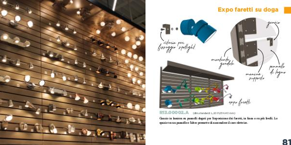 Gancio in lamiera su pannelli dogati per l’esposizione dei faretti, in linea o su più livelli. Lo