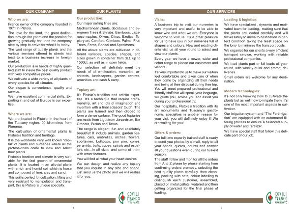 A business trip to visit our nurseries is very important and useful to be able to know who and what we are . Everyone is welcome to visit us . It ’ s a great pleasure for us to have you in our nurseries full of shapes and colours . New and existing clients visit us all year round to select and view our plants .