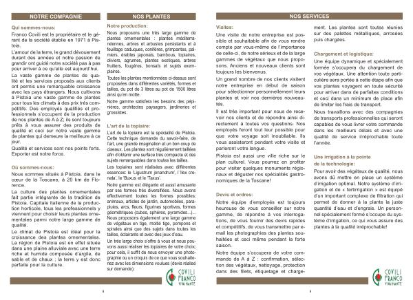 La vaste gamme de plantes de qualité et les services proposés aux clients ont permis une remarquable croissance avec les pays étrangers . Nous cultivons à Pistoia une vaste gamme de plantes pour tous les climats à des prix très compétitifs . Des employés qualifiés et professionnels s ’ occupent de la production de nos plantes de A à Z ; ils sont toujours prêts à vous assurer des produits de qualité et ceci sur notre vaste gamme de plantes qui demeure la meilleure à ce jour .