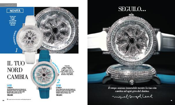 NOVITÀ In una rosa dei venti, il giglio si usa di solito per indicare la direzione del nord. 1 In questa rappresentazione brillante e stilizzata, il giglio punta verso i 4 punti cardinali e gira, per indicare che qualsiasi direzione è disponibile. 2 1. 20849-6 2. 20862-7 199,00€ 199,00€ Cassa in lega di bronzo placcata in Argento con rivestimento in rodio per una maggior resistenza. Embellished with Crystals from Swarovski®. Cinturino in silicone. Ø 40 mm. circa. R4 AD IL TUO NORD CAMBIA QU seguici anche su: facebook.com/ByMiguelAngelLeal Cassa in lega di bronzo placcata in Argento con rivestimento in rodio per una maggior resistenza. Embellished with Crystals from Swarovski®. Cinturino in silicone. Ø 40 mm. circa.